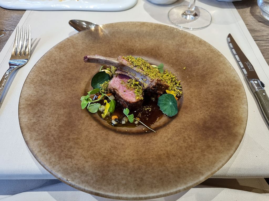 Hauptgänge sind ja oft so etwas, gerade auf den Gourmet-Level, wo wir mit auf dem Kriegsfuß stehen. Hier im Cuisine Rademacher ist das sehr selten der Fall, denn Fleisch kann die Küche hier zubereiten. Heute gab es Lamm aus der Eifel mit orientalischen Gewürzen, Wildkräutern und Gemüse Matignon, also Wurzelgemüse in einer bestimmten Schnitttechnik mit Speck gekocht und mit Weißwein abgelöscht.