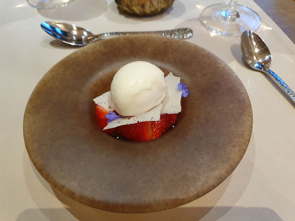Beim ersten Nachtisch gab es noch eine Reminiszenz an einen Klassiker hier, allerdings diesmal in einer neuen Variante: Erdbeer & Veilchen.