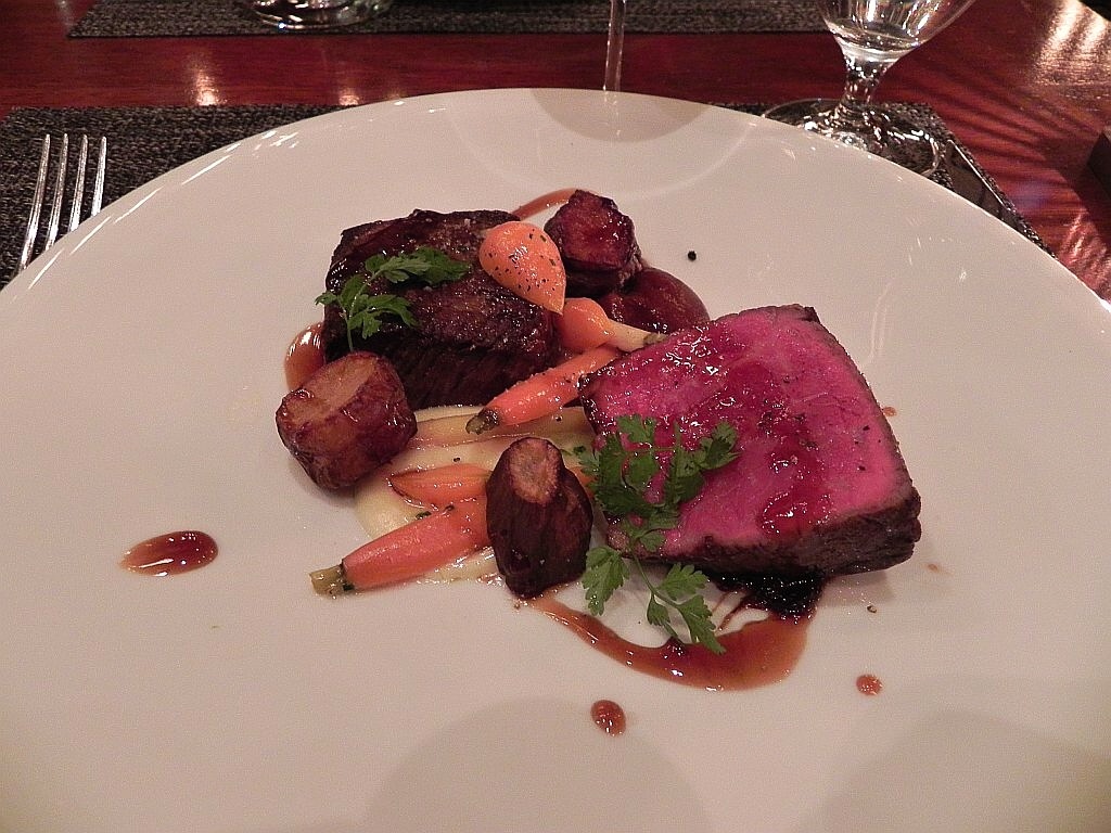 Als Hautpgang gab es ein 30 Tage trockengereiftes (Dry Aged) Sirloin Steak mit Möhren und Pastinaken für Jens und eine Ente mit japanischen Rüben für Meike.