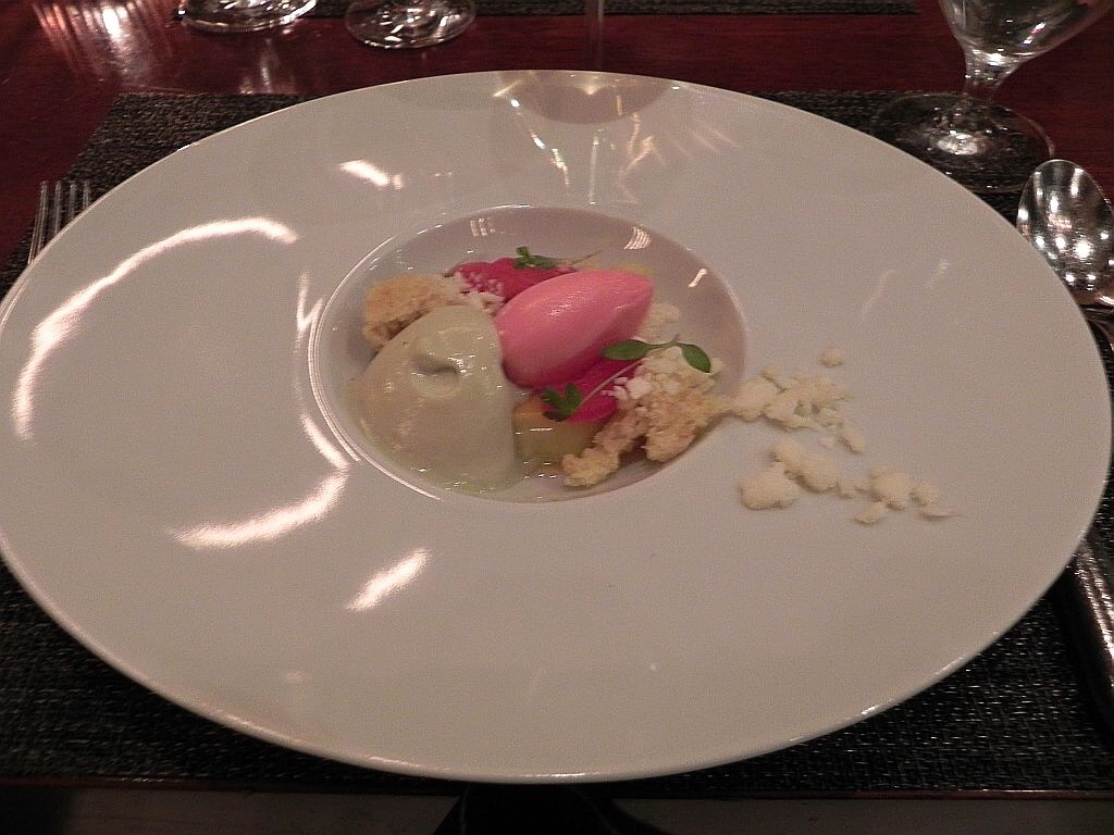 Und als Nachtisch Vanilla-Caramel Eis, weisse Schokolade mit Minze und Rhabarber-Sorbet für Meike und drei verschiedene Käse für Jens.