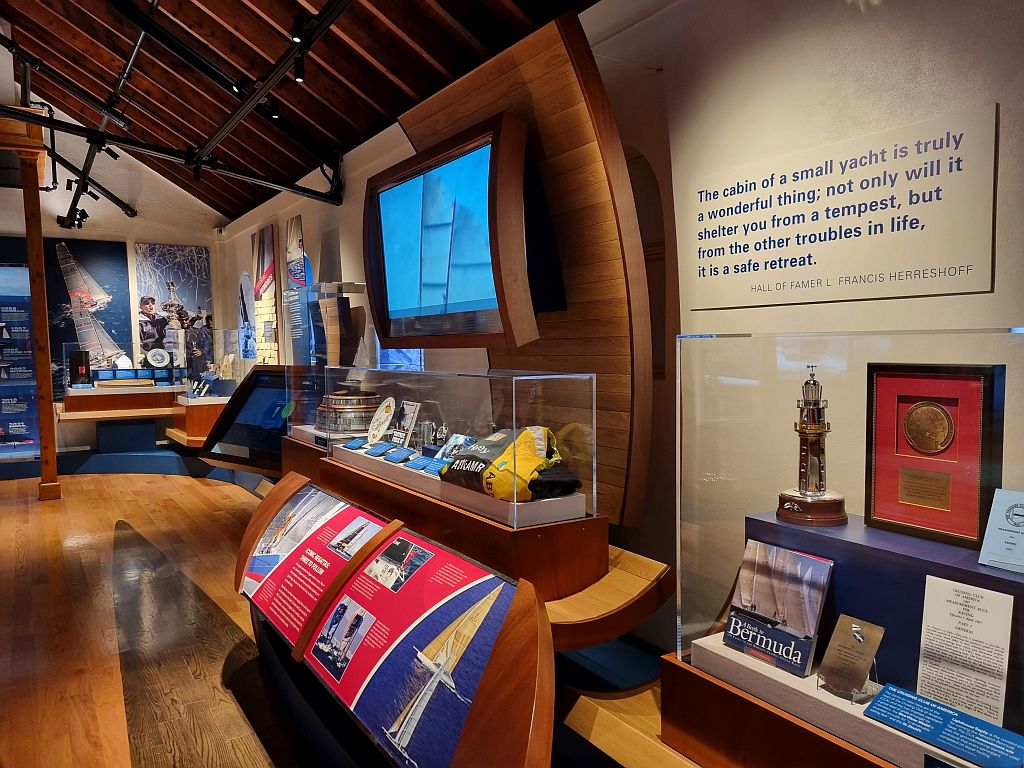 Und da waren wir auch schon (Newport ist nicht so groß). Das Sailing Museum wurde am 10. Mai 2022 eröffnet und soll sowohl Segler als auch nicht-Segler einen Eindruck in den Segelsport bieten. Außerdem gibt es hier eine Darstellung der Geschichte des Segelsports, vor allem des America’s Cup, und somit seit neuestem auch der National Sailing Hall of Fame.