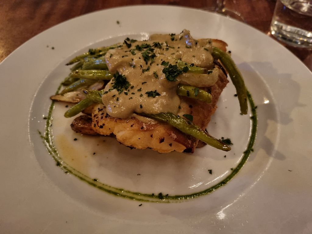 Und Jens hatte ein Stück Heilbutt mit einer rauchigen Sauce – etwas gewöhnungsbedürftig aber auch durchaus lecker.