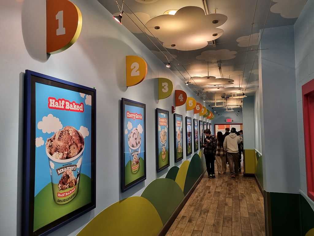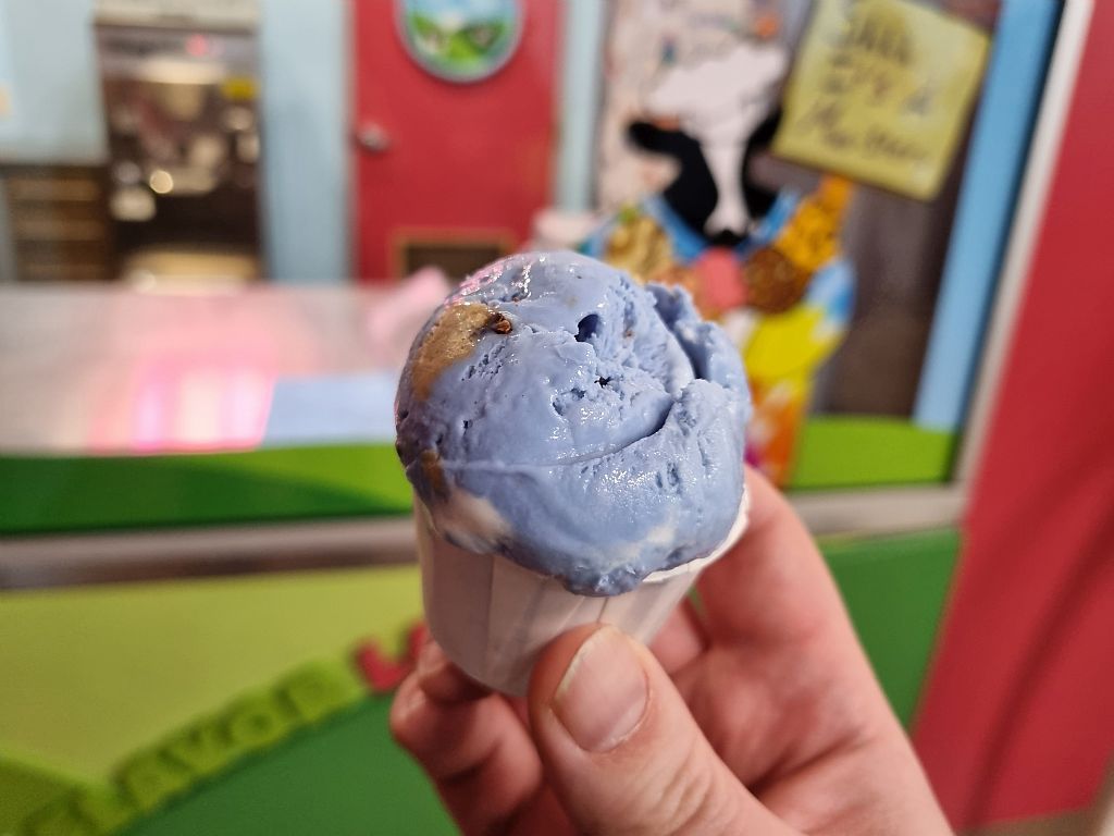 Danach konnte man einen Blick auf die Produktion von Eis werfen, die jetzt nicht wirklich schwierig oder beeindruckend ist. Fotografieren durfte man auch nicht, aber das Ganze war unterhaltsam gemacht und es wurden ein paar witzige Fragen gestellt. Unter anderem braucht man (Thema „unnützes Wissen“) 16 bis 36 Stunden, um die ganze Anlage zu reinigen. Was, da hier doch mehrere Sorten produziert werden, oft passiert.