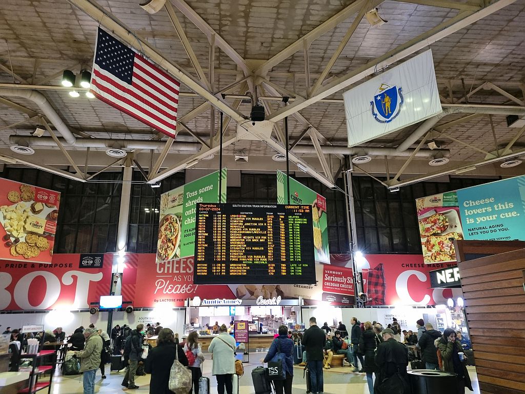 Und schon waren wir an der South Station. Boston hat ja wie einige andere Städte auch mehrere Endbahnhöfe und der größte von diesen ist der Südbahnhof von dem sowohl Nahverkehrszüge als auch Fernzüge wie eben der Acela nach New York und Washington DC oder die langen Strecken nach Chicago oder so abfahren.
