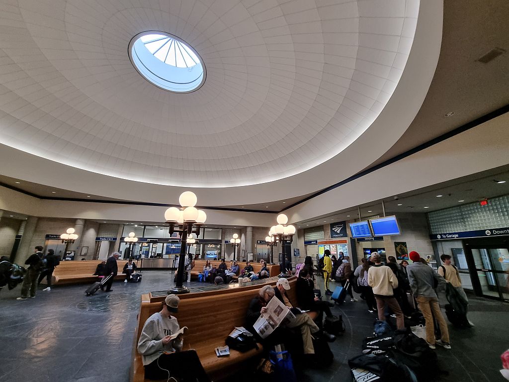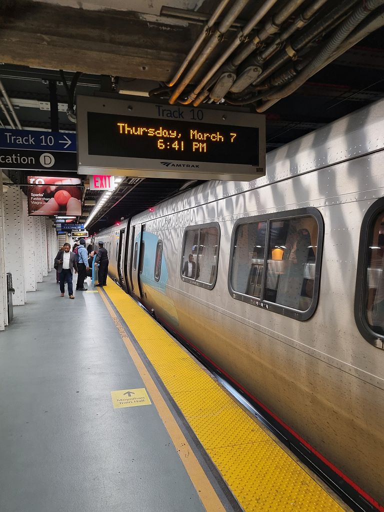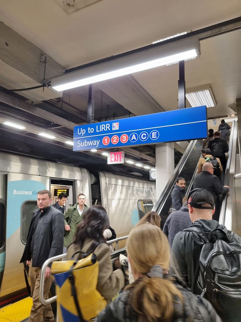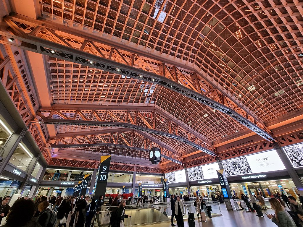 Und schon waren wir in New York, genauer gesagt in der 2021 neu erbauten Moynihan Train Hall, welche die chronisch überlastete Penn Station entlasten soll. Letztere gilt als „Design-Desaster und logistischer Fehlschlag“, was man auch an den echt sehr, sehr engen Bahnsteigen sehen kann.