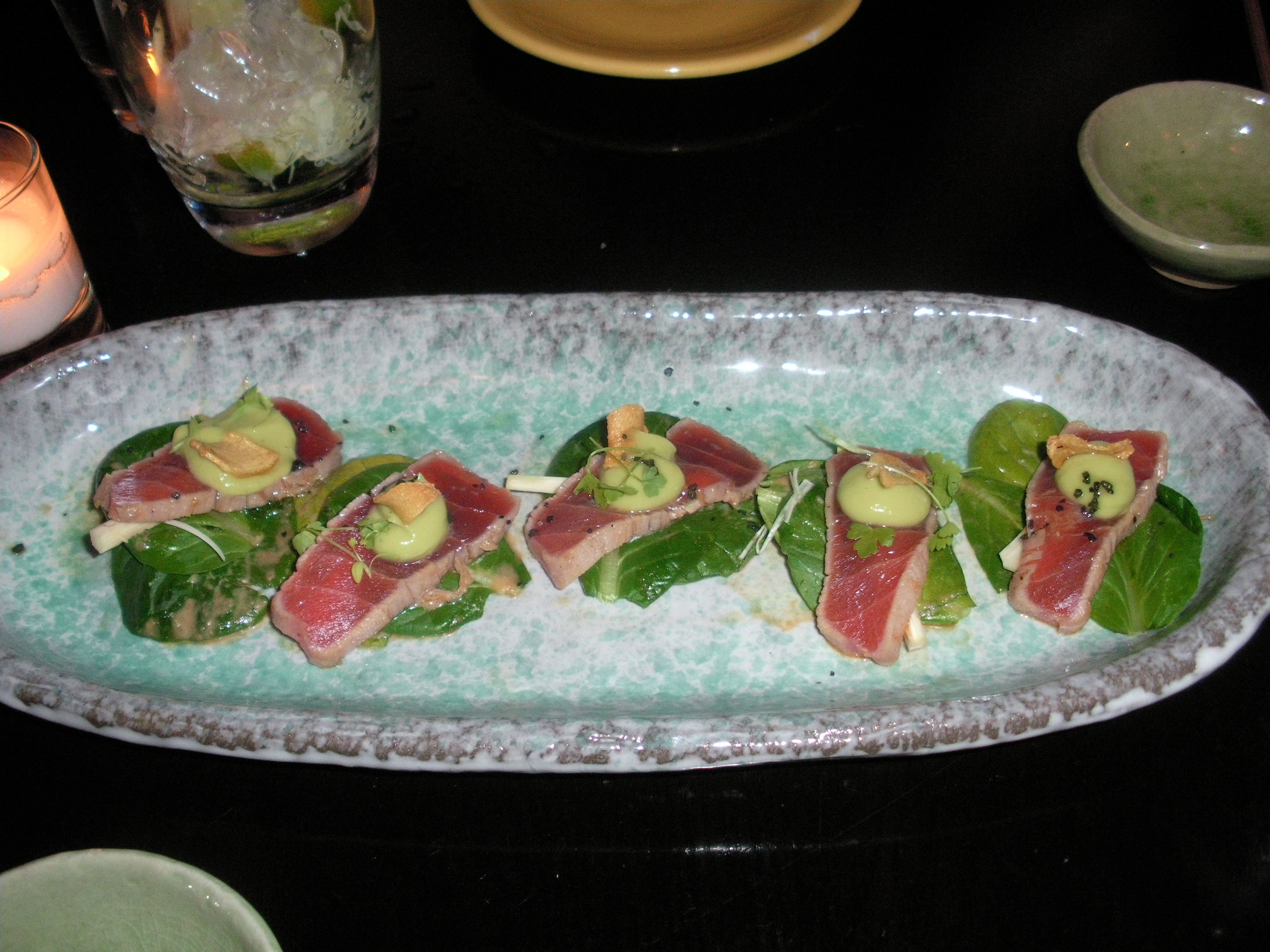 Thunfisch mit japanischem Spinat, Avodardo-Creme und Knoblauch