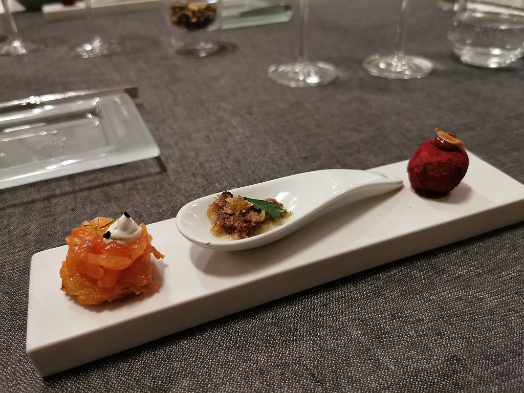 Das Menü wurde bestellt und wie üblich auch eine Weinbegleitung dazu geordert. Drei kleine Grüße aus der Küche kamen dann zeitnah an den Tisch.