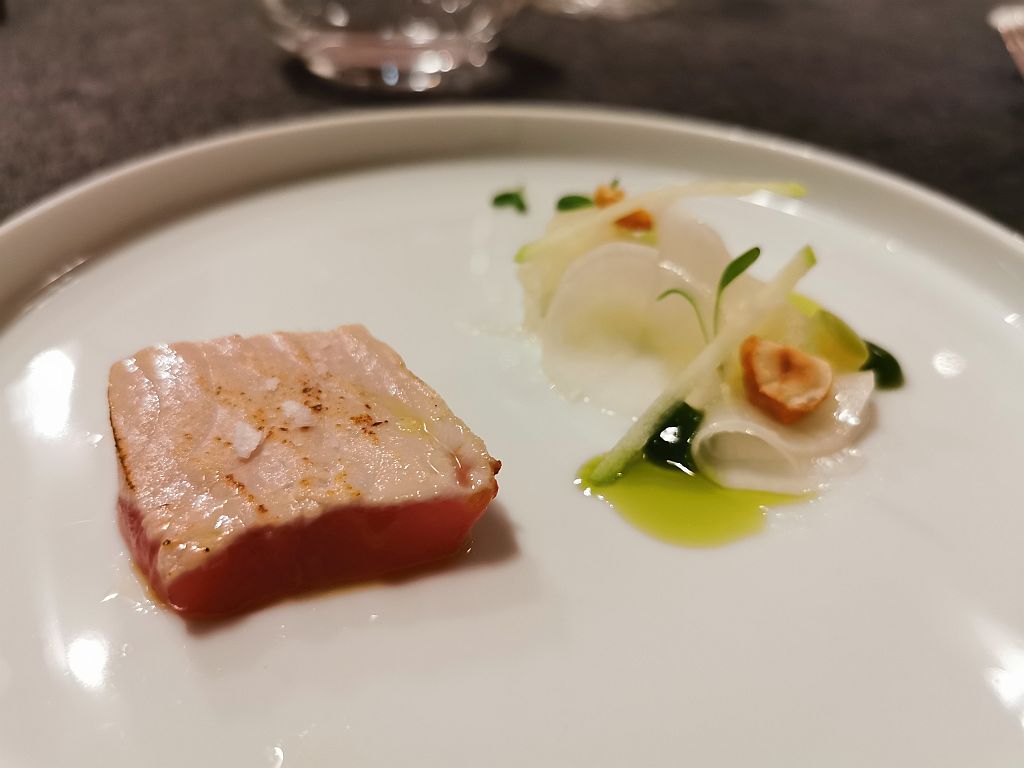 Ein weiterer Gruß war diese geflämmte Gelbschwanzmakrele mit Rettich, Haselnuss und grünem Apfel.