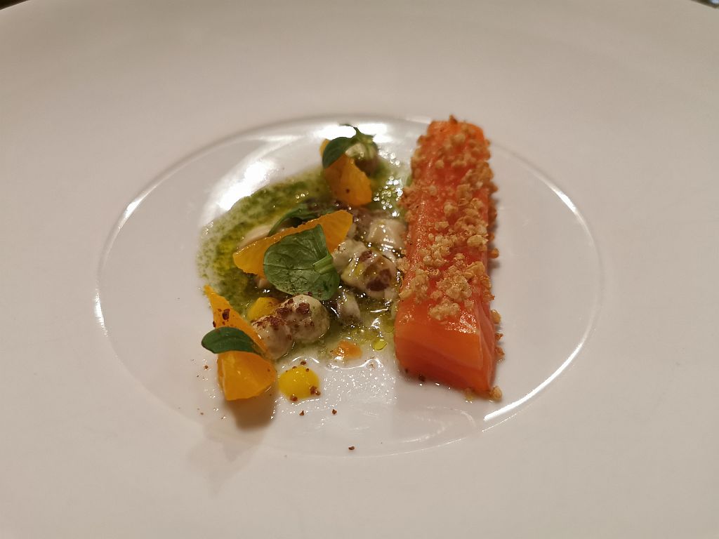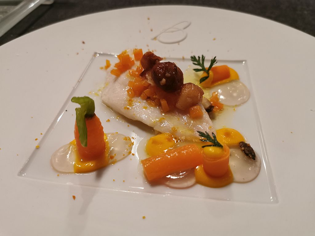 Ein St. Pierre mit Macadamianuss, Karotte, Kürbis und Ingwer war das nächste. Alles sehr herbstliche, winterliche Aromen in den Gängen.