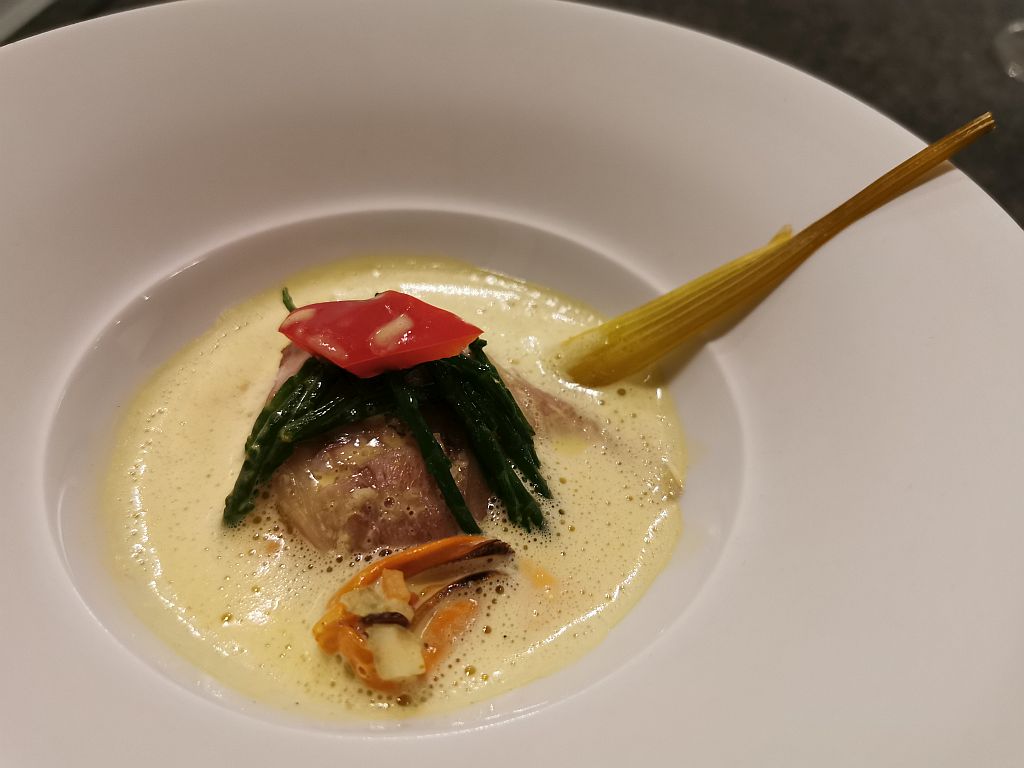 Nächster Gang war dann ein kleines Muschel-Curry mit Fenchel, Meeresspargel und Kalbskopf.
