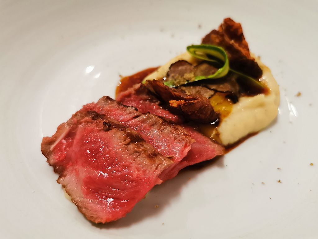 Hauptgang ein Wagyu-Rind aus den USA mit erstaunlich wenig Fett mit Topinambur und einem Trüffel-Eigelb.