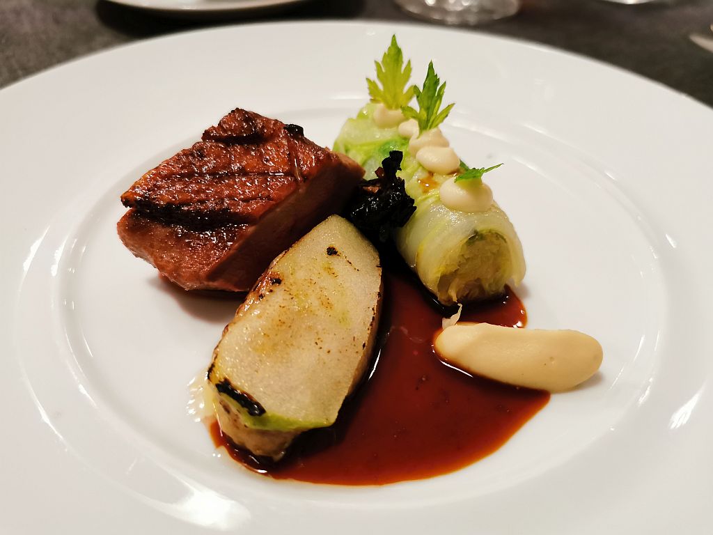 Zweiter Hauptgang dann ein Standard in der Fine Dining Szene: Ente von Claude Mieral mit Apfelessigjus, Sellerie und Spitzkohl.