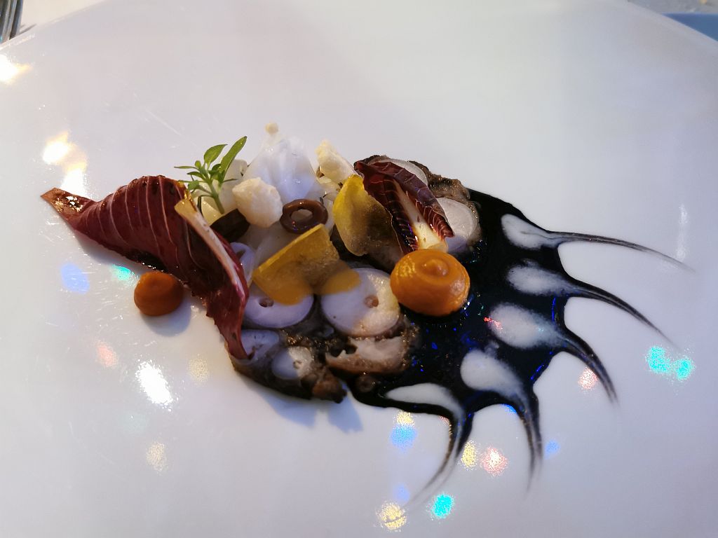 - Gang im Degustationsmenü war dieser unglaublich kreativ angerichtete Oktopus und Kalmar. Dazu Bottarga, Olive, Tomate, Tardivo und ein Parmesanchip.