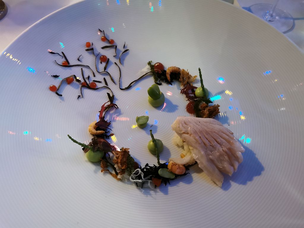Auch der nächste Gang zeigte die filigrane Anrichteweise von Chef Grischa. Der als „japanischer Herbst“ bezeichnete Rochenflügel, Eismeergarnele, Kombu oder irgendwelche andere Meeresalgen, Ume (Pflaume) und ein kleines Zitrus-Dashi, was danach angegossen wurde.