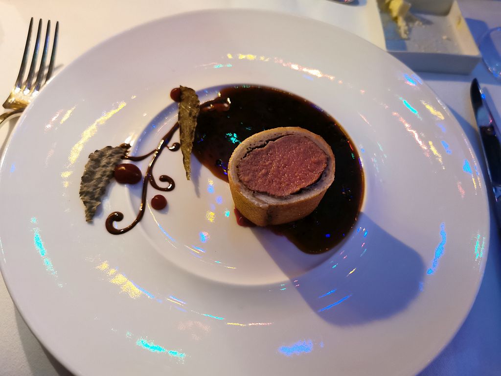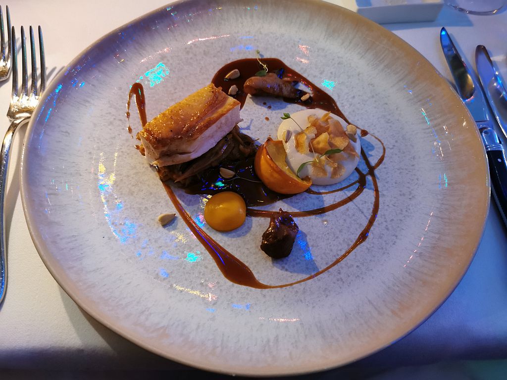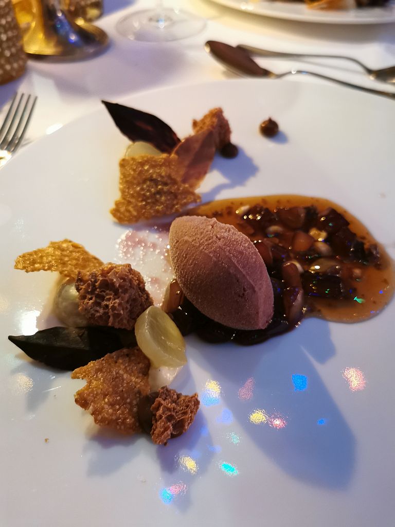 Dazu eine feste und reichhaltige Sauce mit Herbsttrüffel, Hagebutte, Rotkohlgel und etwas dunkle Schokolade. Auch wieder sehr kreativ und sehr, sehr lecker.
