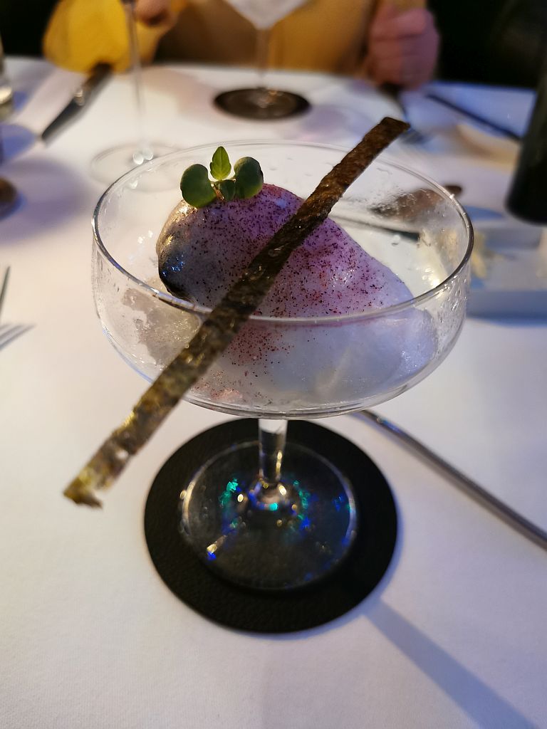 Ein, wieder asiatisch angehauchter, Zwischengang mit einem Staub aus rotem Shisoblatt, Kirschblüteneis, Sake, Tonic und einem Nori-Chip.