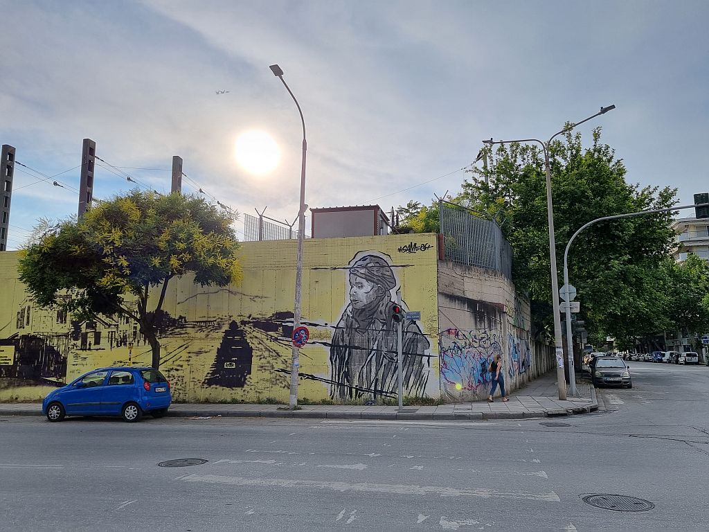 Dafür fanden wir an der Stirnseite des Kopfbahnhofes dieses Wandgemälde, was an die Geschichte der jüdischen Gemeinde Thessalonikis erinnern soll. Sie hatte vor dem Zweiten Weltkrieg rund 53.000 Mitglieder. Nur rund 1950 Juden aus Thessaloniki überlebten den Holocaust in Griechenland und die Vernichtung der jüdischen Gemeinde.