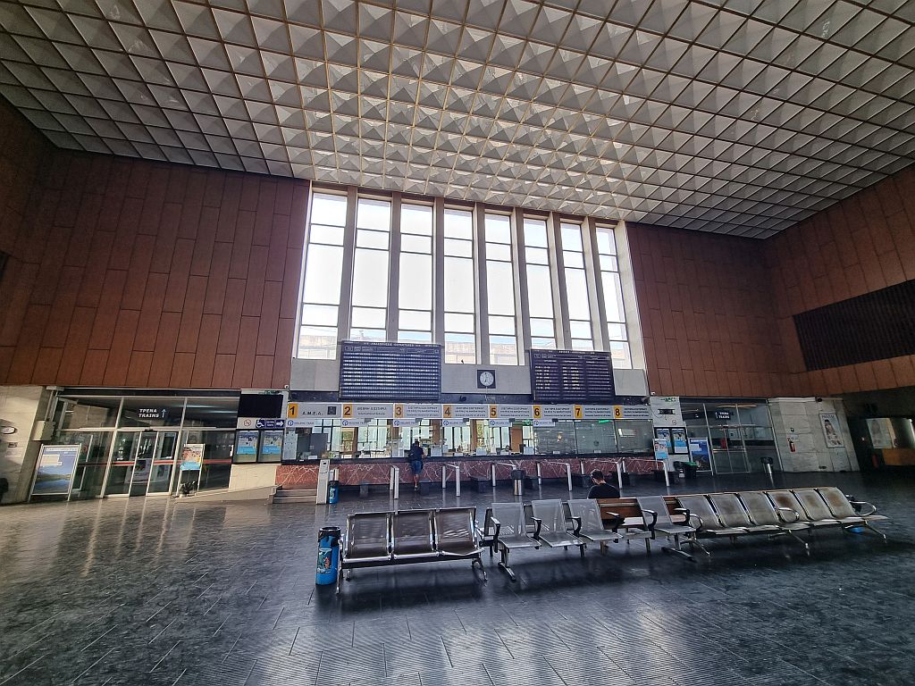 Den Baustil nennt man übrigens „Neue Sachlichkeit“ und auch im Inneren sieht man noch die Bedeutung des 1961 eröffneten Bahnhofes. Auch wenn heute, bis auf ein paar Touristen, ein paar Griechen und einen Betrunkenen nicht viel zu erkennen war.