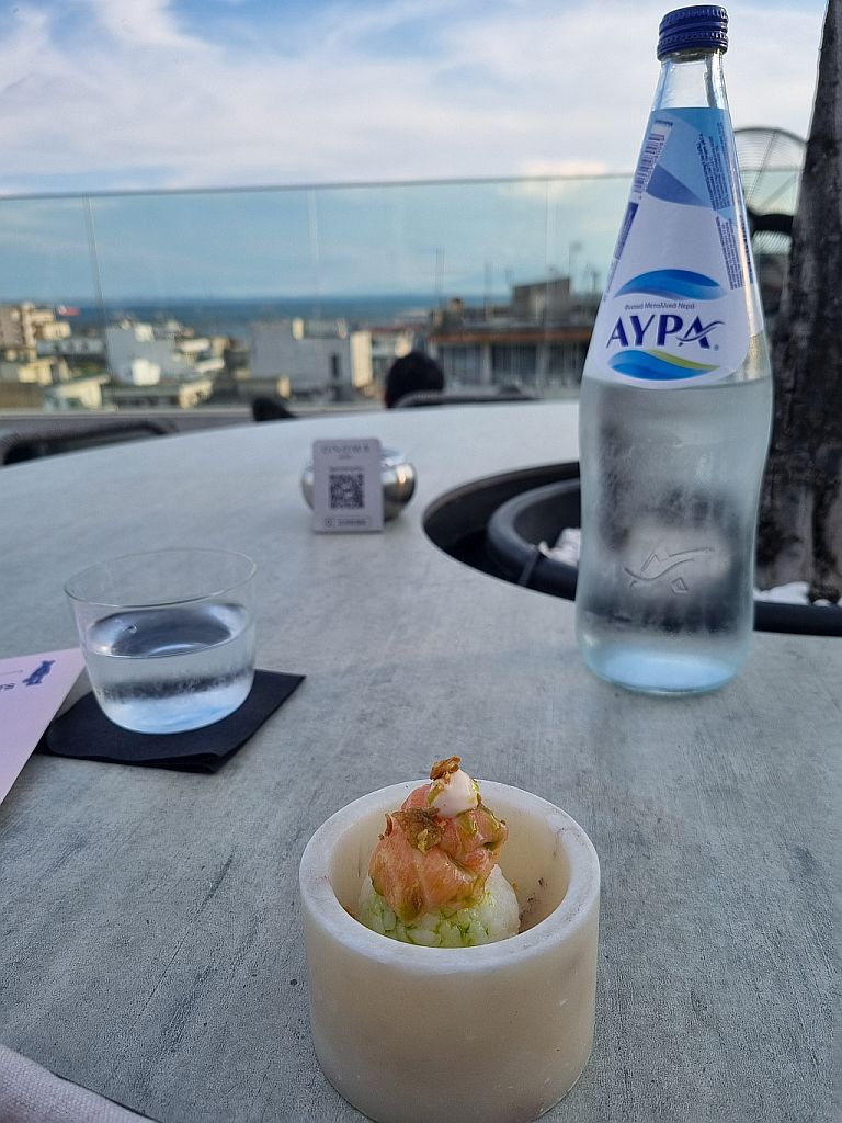 Gut, das mit der Reservierung hätte nicht sein müssen, denn am Ende war nur noch ein weiterer Tisch spontan belegt und ein griechisches Pärchen saß am Anfang noch bei einem Cocktail dort rum.