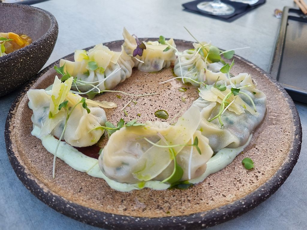 Aus dem eher asiatisch angehauchten Menü suchten wir uns dann insgesamt 4 Gerichte zum Teilen aus. Alle sehr nett angerichtet und vor allem die Dumplings fanden wir sehr lecker, wenn sie euch eher in Richtung der georgischen Khinkali gehen, weil so viel Brühe drin war.