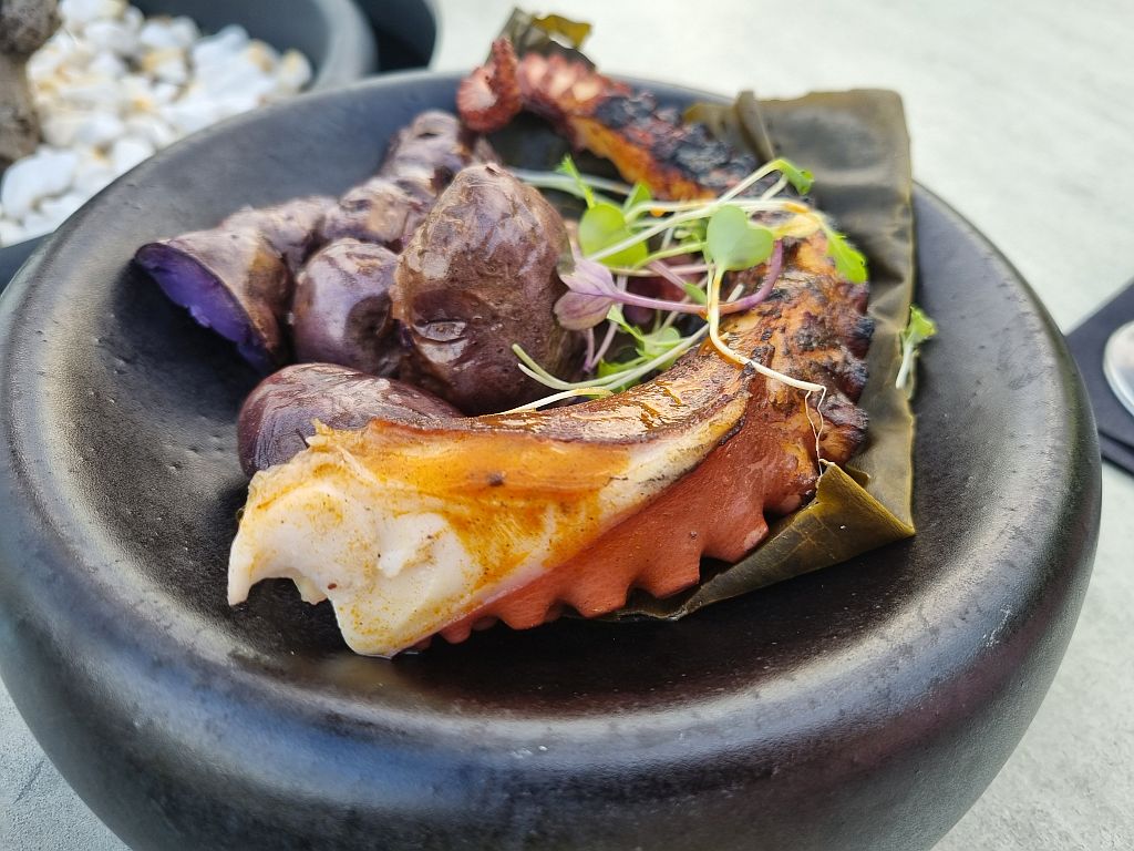 Ein recht stark gerösteter Pulpo mit einer ordentlicher Menge violetter Kartoffeln – eher nicht so gut.
