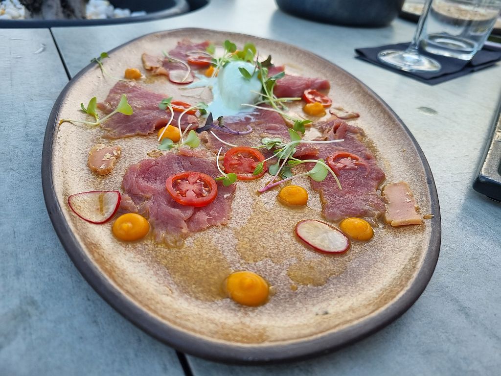 Das Thunfisch-Carpaccio mit Borttarga, also gesalzener, gepresster und an der Sonne getrockneter Rogen der Meeräsche war dagegen echt gut. Auch wenn Meike kein Borttarga Fan wird. In Griechenland nennt man das Avgotaraho und hier wird es mit Bienenwachs zum Schutz überzogen.