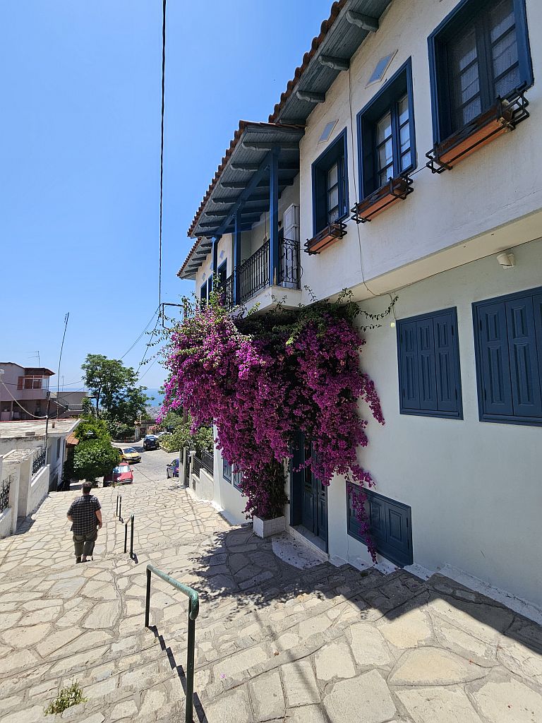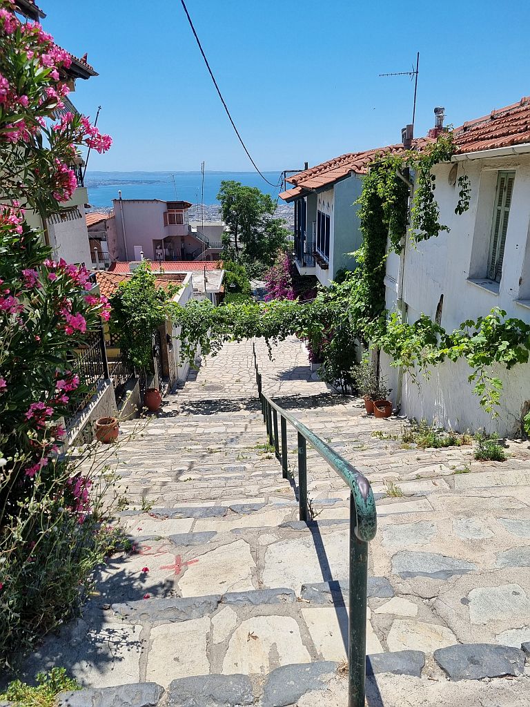 Von hier oben aus ging es dann eine kleine Straße entlang zum nächsten Punkt. Die Oberstadt geht auf die erste christliche Gemeinde im 4. oder 5. Jahrhundert zurück. Nach Eroberung durch die Türken 1430 schrumpfte die Einwohnerzahl fortwährend bis ins 16. Jahrhundert, erlebte dann aber wieder eine gegenläufige Entwicklung als die Moslems vor allem wegen des gesünderen Klimas, aber auch um ihre Präsenz zu unterstreichen, eher in höhergelegene Viertel zogen. Ano Poli blieb auch nach 1912, dem Ende der osmanischen Herrschaft, ein moslimisch geprägtes Viertel, während in dem Teil der unteren Stadt, die direkt ans Meer grenzt, der jüdische Anteil zwischen 60% und 90% betrug und die Griechen in ihren traditionellen Vierteln im Osten und Westen von Thessaloniki lebten. Während der Brand in Thessaloniki 1917 große Teile der Bebauung in der unteren Stadt zerstörte, hat sich in Ano Poli ein Großteil der Stadtgestalt aus byzantinischer und osmanischer Zeit erhalten. In den Jahren nach 1922 hatte Ano Poli durch Flüchtlinge aus Kleinasien eine hohe Bevölkerungsdichte. Als eine Generation später die erwachsen gewordenen Kinder der Flüchtlinge in komfortablere Viertel zogen, verlor Ano Poli Einwohner, bevor es gegen Ende des 20. Jahrhunderts durch verschiedene städtebauliche und denkmalpflegerische Maßnahmen aufgewertet und zunehmend zu einem touristischen Ziel wurde. Dadurch setzte eine in den Teilen des Stadtviertels unterschiedlich stark ausgeprägte Gentrifizierung ein.