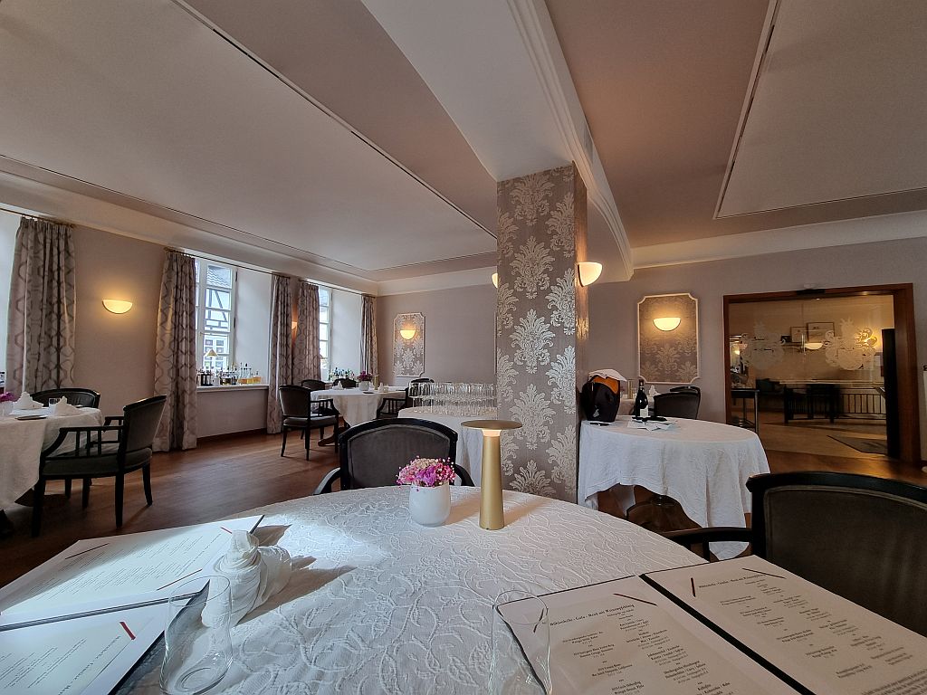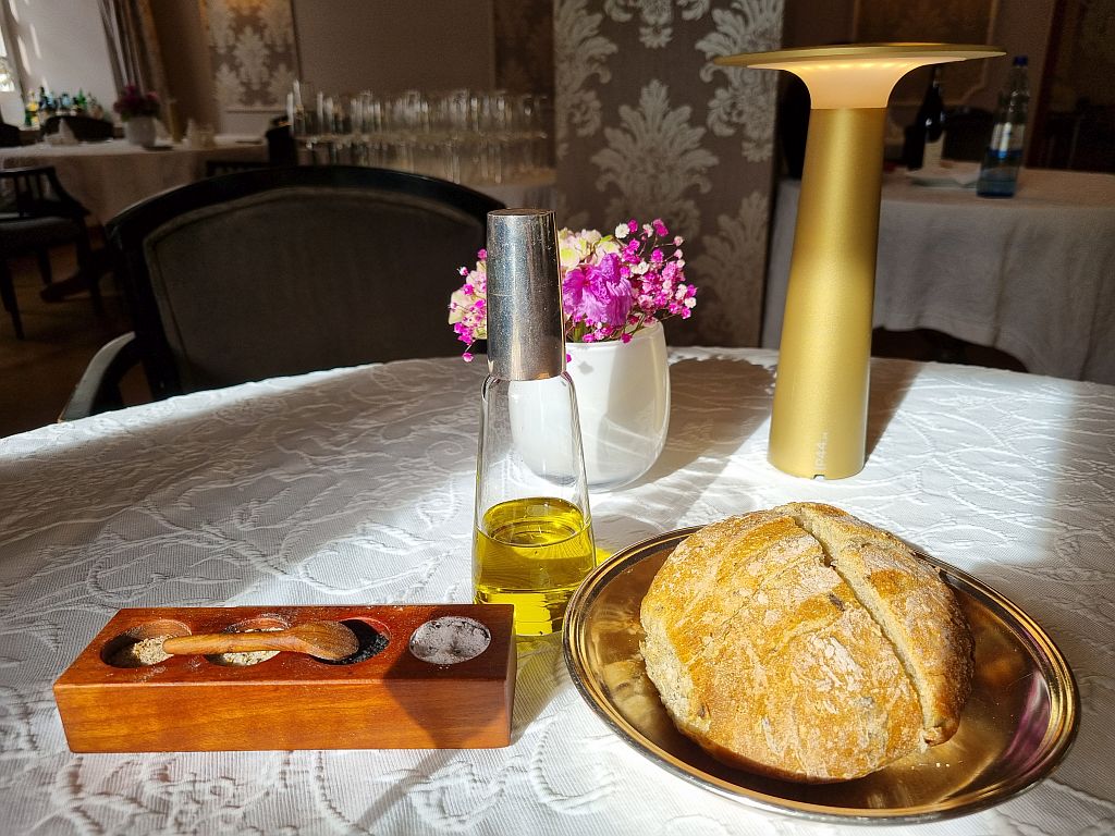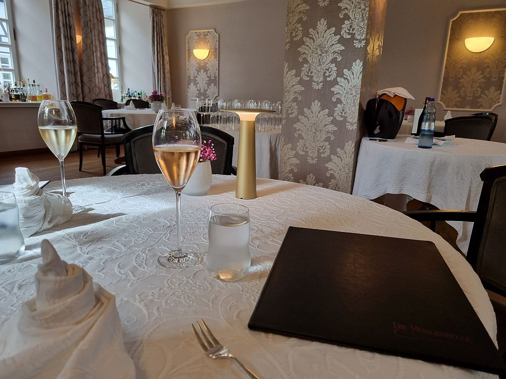 Also: Wasser war da, wir akklimatisierten uns ein wenig und ließen den Blick durch den Raum schweifen, der irgendwie wie Gourmet-Restaurant mit leichter Tendenz zu einer gemütlichen, alten Bauernstube wirkte. Wir fanden es schön und irgendwie urig.