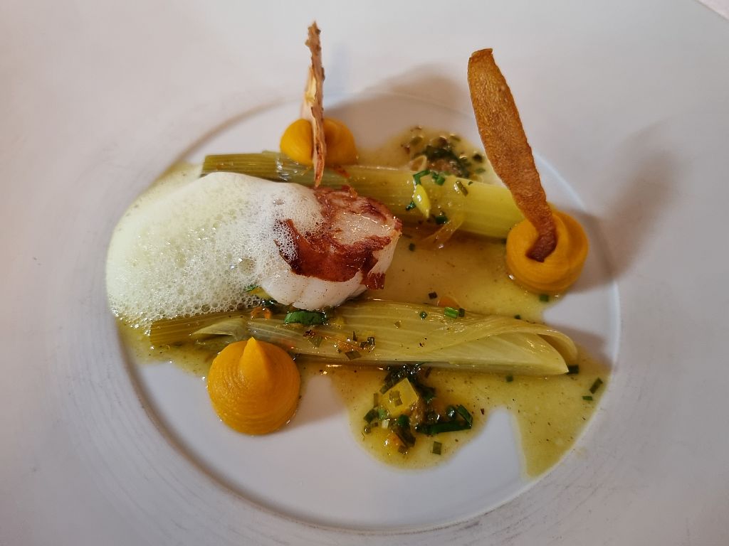 Dann ging es aber zu den Gängen selber und gestartet wurde mit einer recht klassischen Kombination aus Garnele und Curry. Dazu gab es von der Konsistenz her sehr passende, weil etwas festere Petersilienwurzeln sowie ein süßes Apfelgelee (was uns aber unserer Erinnerung nach als Birne angekündigt wurde).