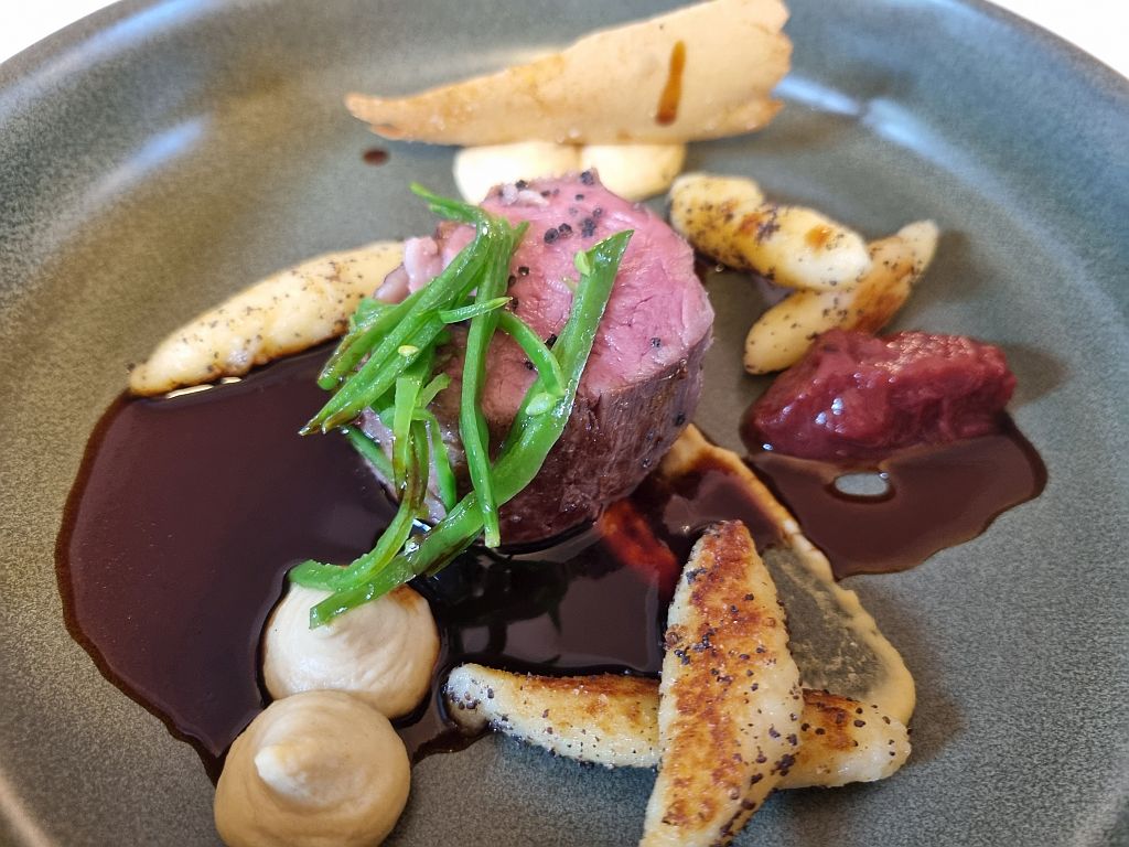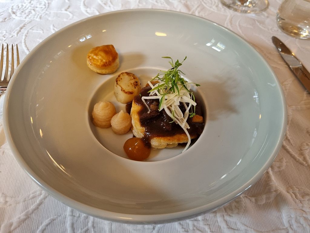 Weiter im Menü: Hirschragout vom lokal geschossenen Hirschen auf einem Blätterteig, Holunderblüten, Selleriepüree, angebratener (und vermutlich geschmorter) Sellerie und einem Fruchtgel. Von letzterem wissen wir leider nicht mehr, was es genau war.