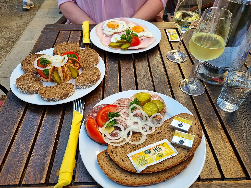 Und der üblichen Bestellung bestehend aus einem Strammen Max, Spundekäs und einer Wurstplatte.