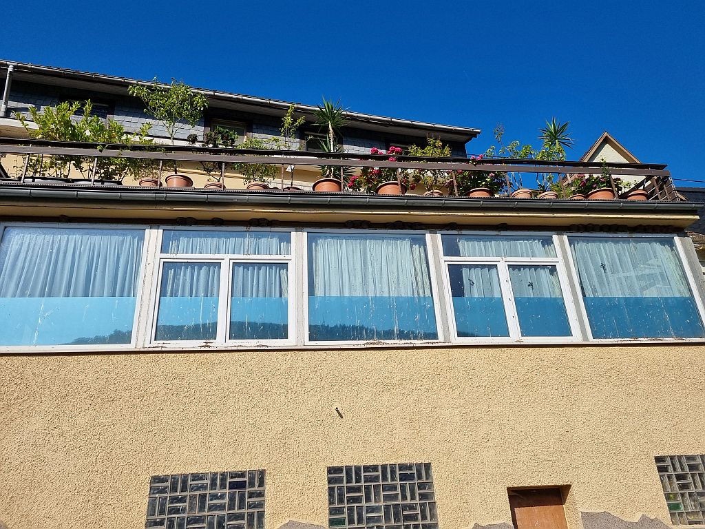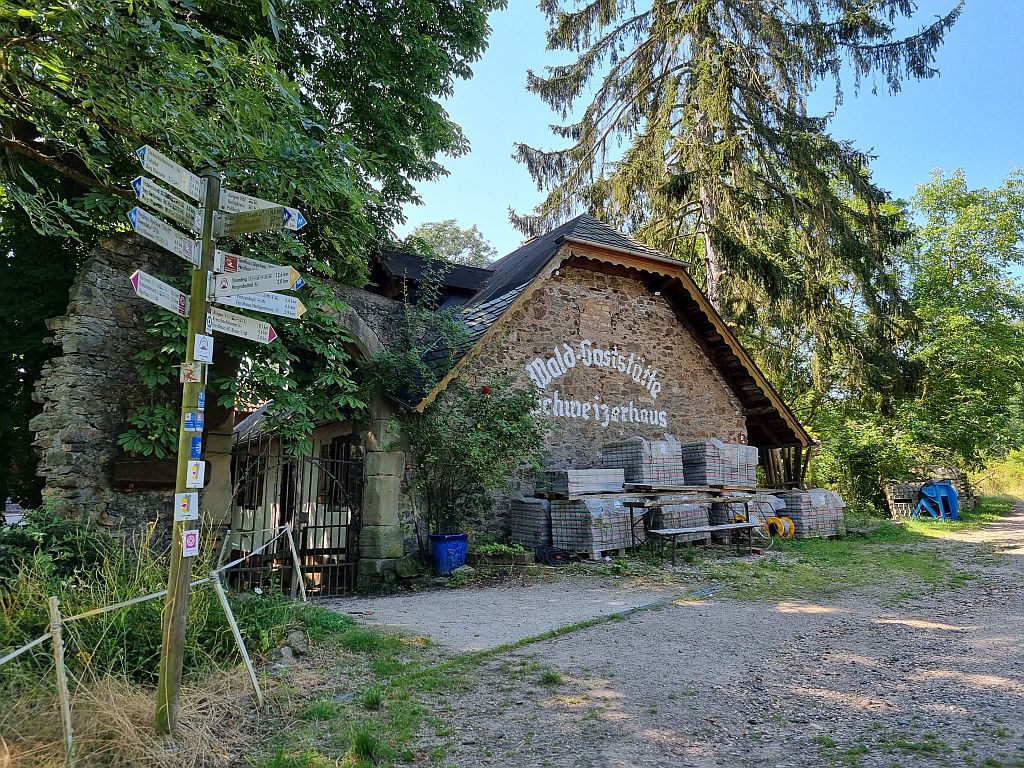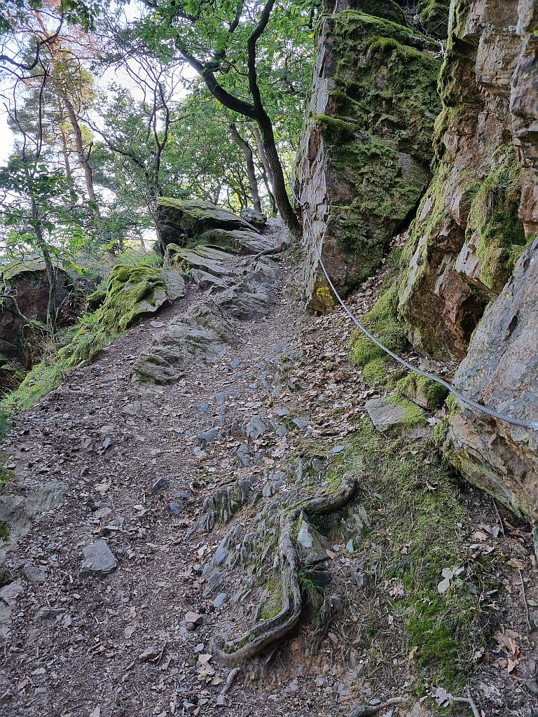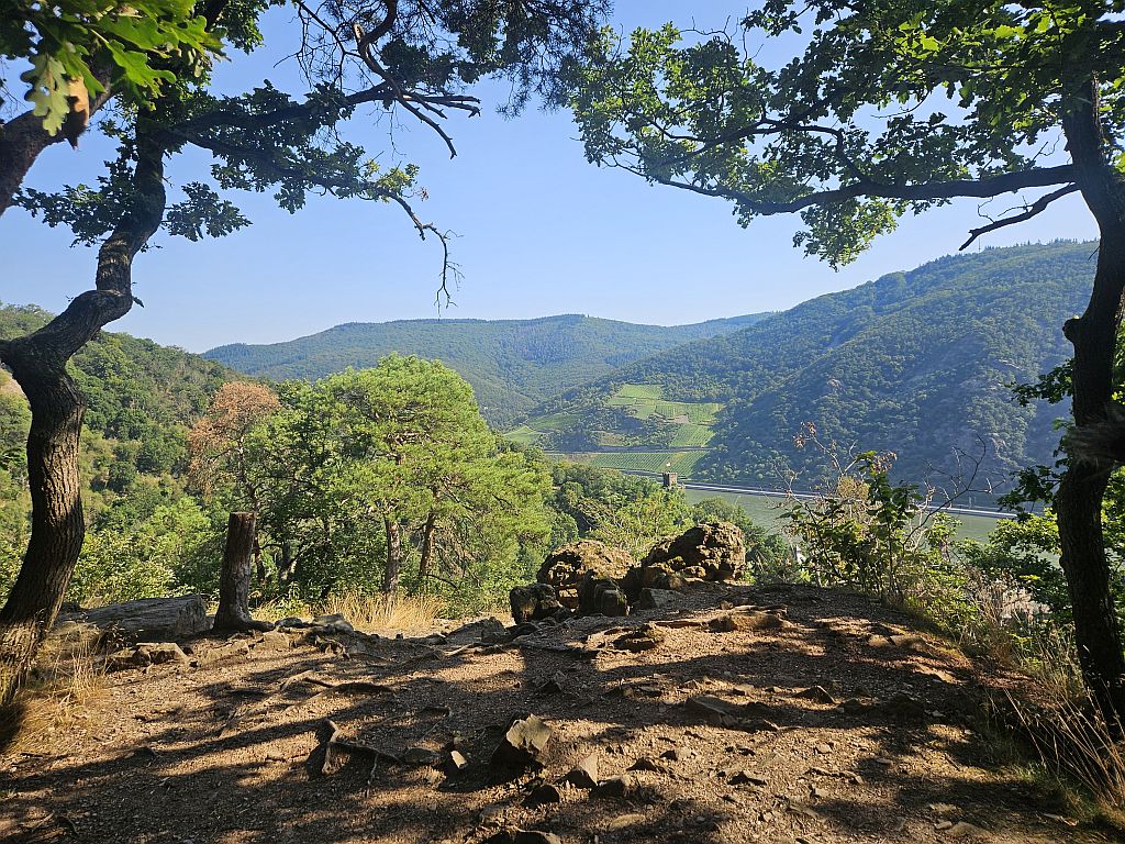Danach ging es recht steil und fast direkt wieder hinauf. Nicht wie sonst in Serpentinen, auch eher selten auf dem RheinBurgenWeg. Oben angekommen wäre erneut eine Einkehrmöglichkeit gewesen, das Schweizerhaus hat aber aktuell aufgrund von Renovierungsarbeiten geschlossen. Schade, denn der Blick wäre schon cool gewesen.