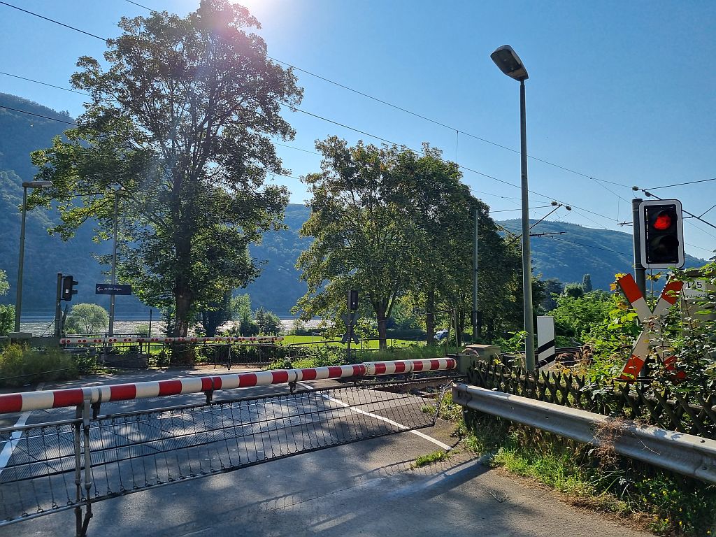 Denn die erste Schranke wartete noch auf einen Güterzug in Richtung Koblenz bevor sie den Weg freigab.