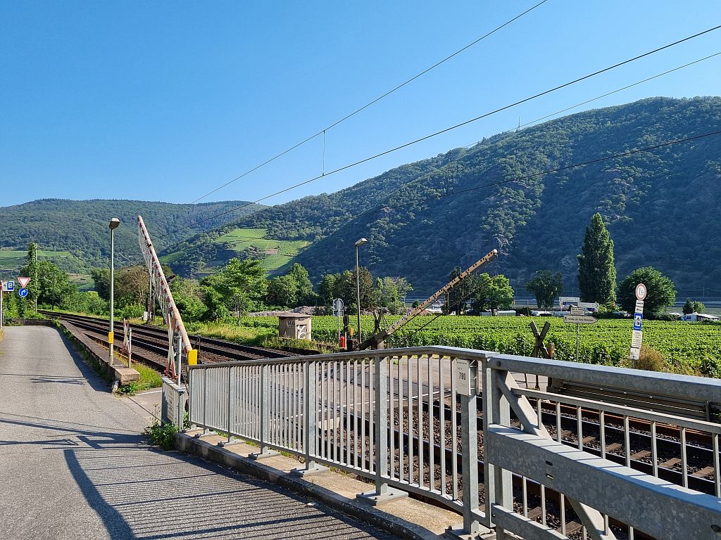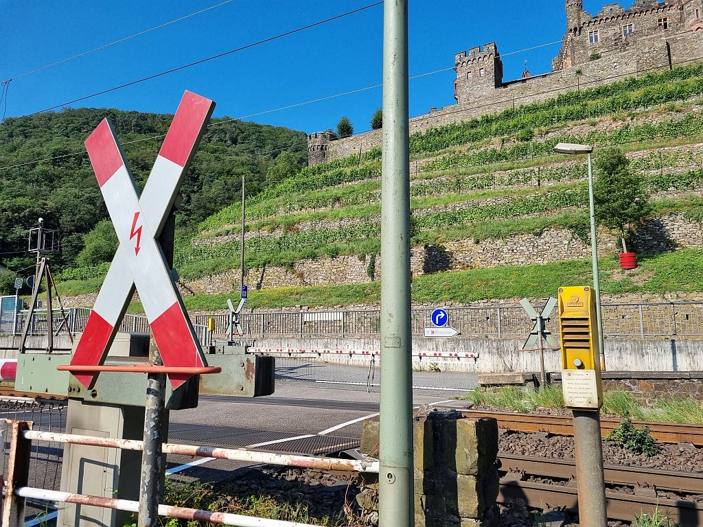 Um dann nach etwa einem Kilometer zur ersten Burg der Etappe, der Burg Reichenstein, zu kommen mussten wie wieder über die Bahngleise. Und das war hier was schwieriger, denn dieser Bahnübergang ist immer geschlossen. Damit er geöffnet wird, muss man per Sprachtaste dieses anmelden. Als Antwort kam erst einmal, das noch ein Zug käme und dann die Schranke geöffnet wird.