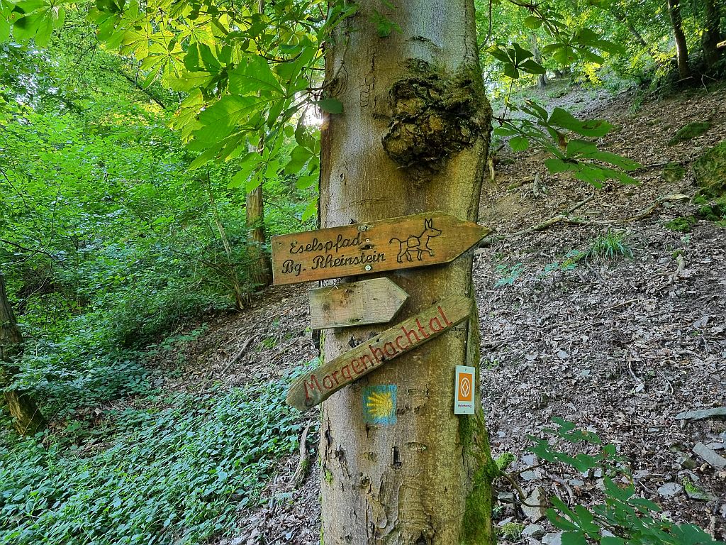 Für uns ging es jetzt hinter der Burg Reichenstein hinein in das Morgenbachtal, einem kleinen Bach, der hier in den Rhein mündete. Nachdem wir einem hochmotorisierten polnischen Mustang, der sich offensichtlich verfahren hatte, ausgewichen sind, ging es dann auch auch vom Bach weg den ersten Anstieg hinauf. Endlich möchte man sagen.