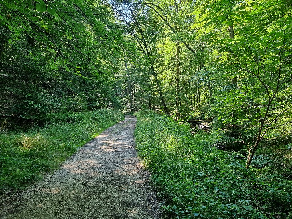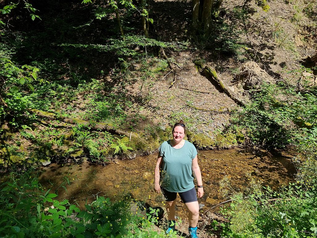 Vorteil, wenn man an einem Bach entlang geht: Schlimme Steigungen sind nicht zu erwarten. Und Zusatzvorteil bei diesem Wetter: Man kann sich mal die Hände und das Gesicht kühlen.