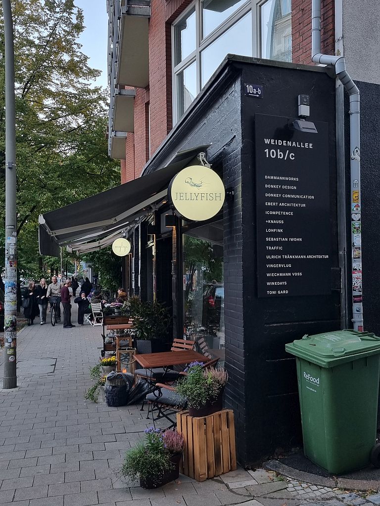 Heute Abend sollte es zuerst das mit 2 Michelin Sternen gekrönte bianc werden, dort waren aber auf einmal keine Tische mehr frei. Also ging es zu einem weiteren interessanten Gourmet-Kandidaten: Dem Restaurant Jellyfish mitten in der Sternschanze gelegen. Ein recht neuer Kandidat auf der Gourmet-Karte, wo Chef Sven Fäth seit 2019 das Zepter als Küchenchef und Inhaber in der Hand hält.