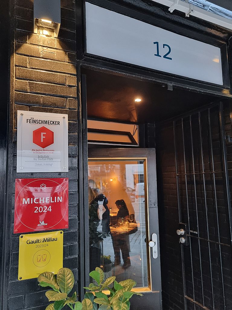 2022 gab es den Stern und dieser wurde zwei Mal verteidigt. Zur Küche hier schreibt der Guide „Wer Fisch- und Meeresfrüchte-Küche mag, ist im „Jellyfish“ genau richtig. Diese wird in Form eines Menüs mit vier, sechs oder acht Gängen angeboten. Hier findet man auch eine hervorragende „Ausnahme“ in Form eines Fleisch- oder Geflügelgerichts. Ausgesuchte Produkte werden durchdacht und modern-kreativ zubereitet, toll das Handwerk. Und der Rahmen zum guten Essen? Das im Schanzenviertel gelegene Restaurant ist angenehm puristisch gehalten, die volle Aufmerksamkeit gilt der finessenreichen und interessanten Küche. Ein weiterer Wohlfühlfaktor ist der pfiffige, aufmerksame und fachkundige junge Service, der auch die passenden Weine empfiehlt.“