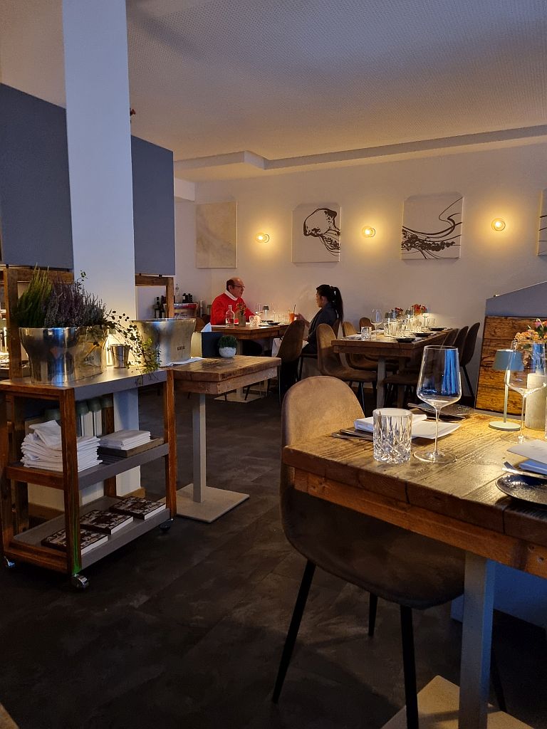 Na dann mal rein in den schön und puristisch modern eingerichteten Gastraum. Gleich wurden wir vom recht jungen Service in Empfang genommen und zu unserem Tisch in einer Ecke am Fenster geführt.