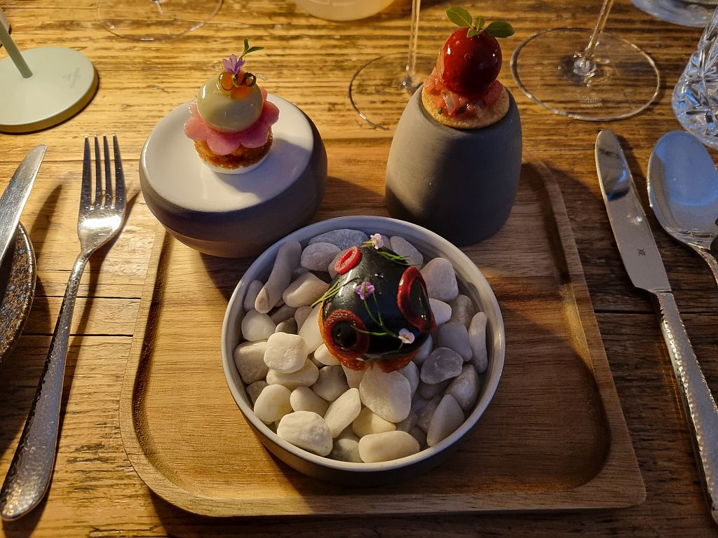 Zu unserem Tisch fanden dann auch drei handwerkliche Schmuckstücke ihren Weg zu unserem Tisch: Eine Dashi Macaron (oben links), ein Bruschetta mit einer Fake-Tomate (oben rechts) und eine Art Matjes-Praline. Alles sehr, sehr schön anzusehen und ein beeindruckender Einstieg in das Menü.
