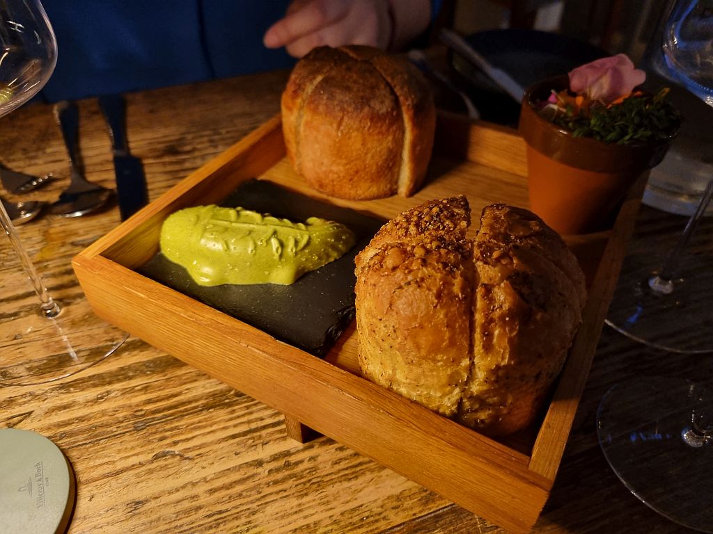 Brot gab es danach auch, der „Blumenkasten“ rechts ist ein Hummus mit recht vielen Blüten verziert. Meike schmeckte das sehr gut, Jens war dagegen mit der Butter sehr zufrieden. Wobei das Brot hier nur eine Nebenrolle spielte, aber dennoch lecker war.