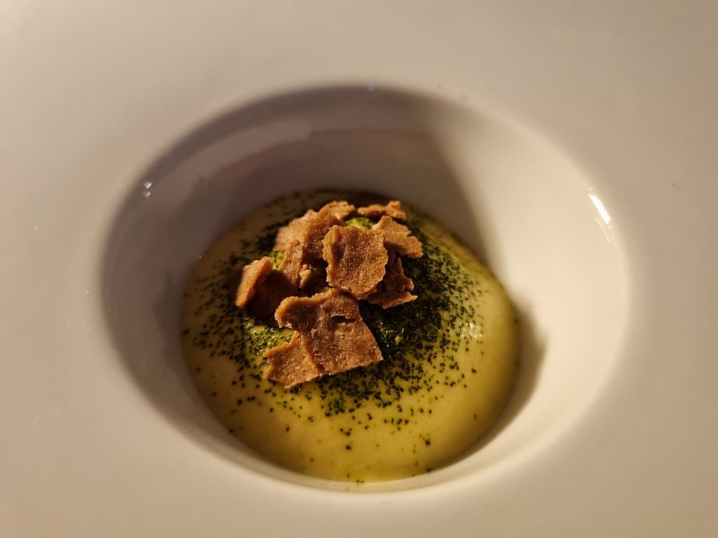 Dann ging das Menü selber los, traditionell, wie uns vom Service mitgeteilt wurde, mit einem vegetarischen Gang. Passenderweise „Salat“ genannt: Fenchel, Staudensellerie und Kohlrabi. Erinnerte uns sehr an die ersten Gänge im Tian letztes Jahr, war aber irgendwie doch etwas kräftiger und … verspielter. Der süß-kräftige Sud mit dem Öl fügte die einzelnen Komponenten recht gut zusammen, nur der „Keks“ war irgendwie fehl am Platze für uns. Aber so gab es dann auch etwas Textur zu dem eher weicheren Gang.