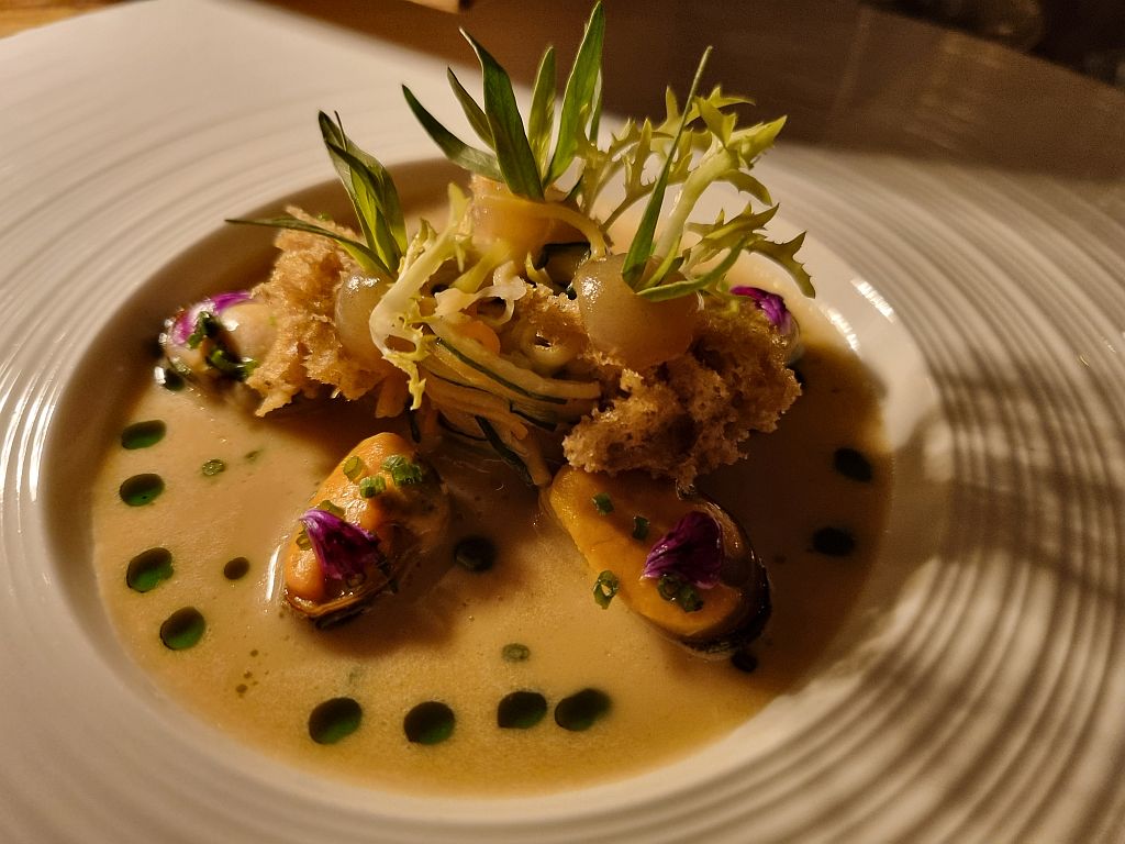 Der nächste Gang war einer, auf den wir uns schon etwas gefreut haben und leider war es der Gang, wo wir als einziges etwas auszusetzen hatten. Es ging um die Miesmuscheln „Rheinische Art“. Die Muscheln waren nämlich etwas sandig bzw. schmeckten sandig. Irgendwie war es halt nicht so wie wir es auch gedacht haben. Wobei die anderen Komponenten sehr passend waren und auch der Riesling Sud sehr voll im Geschmack war.
