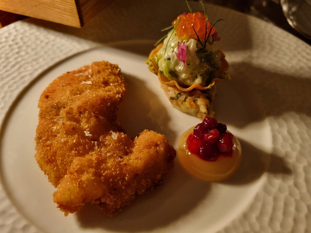 Festes, fast schon saftiges Fleisch, schöne Pannade, ein kleiner Klecks Preiselbeeren auf Zitronengel. Oben eine Nocke Kartoffelsalat getoppt von einem echt sehr guten Gurkensalat und ein paar Fischeier.