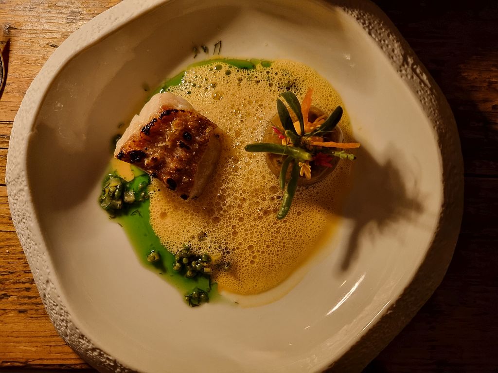 Dann aber kam der isländische Rotbarsch zu uns (glücklicherweise mit einem wieder etwas kleineren Teller) mit Aubergine, Salzkräutern und einem Safranschaum. Gerade die Salzkräuter mit dem Schaum waren sehr lecker und passten zum Fisch.