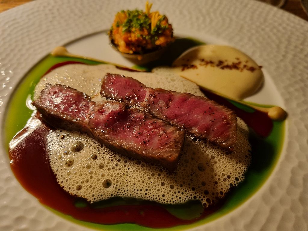 Danach gönnten wir uns einen Zusatzgang: Miyazaki Wagyu A5! Da sind wir doch eher Bauch-gesteuert und haben so ziemlich gar keine Selbstkontrolle. Was in diesem Fall gut war, denn das Ganze war sehr gut gemacht. Einziger Wehrmutstropfen war, dass im Fleisch eine Sehne war, die in zwei Bissen etwas das Erlebnis getrübt hat. Das Knochenmark dagegen hat eine wunderbare Aromenwelt zu dem Gang hinzugefügt und die Sehne fast vergessen lassen.