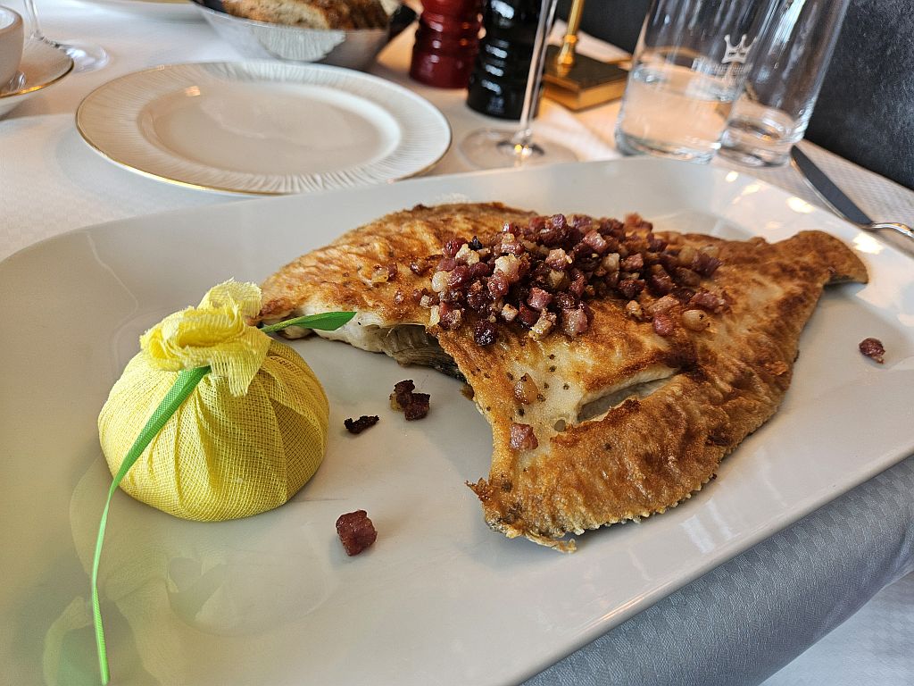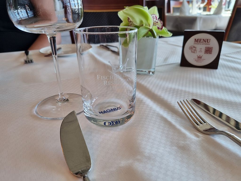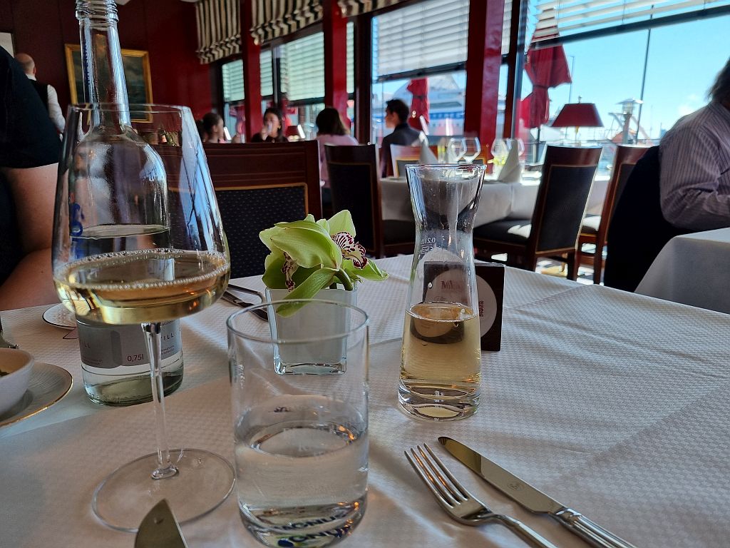 Als Wein gab es natürlich in so einem Ambiente einen Weißwein. Bier wäre auch noch gegangen, bei einem Rotwein wäre vermutlich der Stuhl mittels Katapult aus dem Restaurant in die Elbe befördert worden. Mitsamt dem Frevler, der es wagt einen Rotwein zu Fisch zu bestellen.