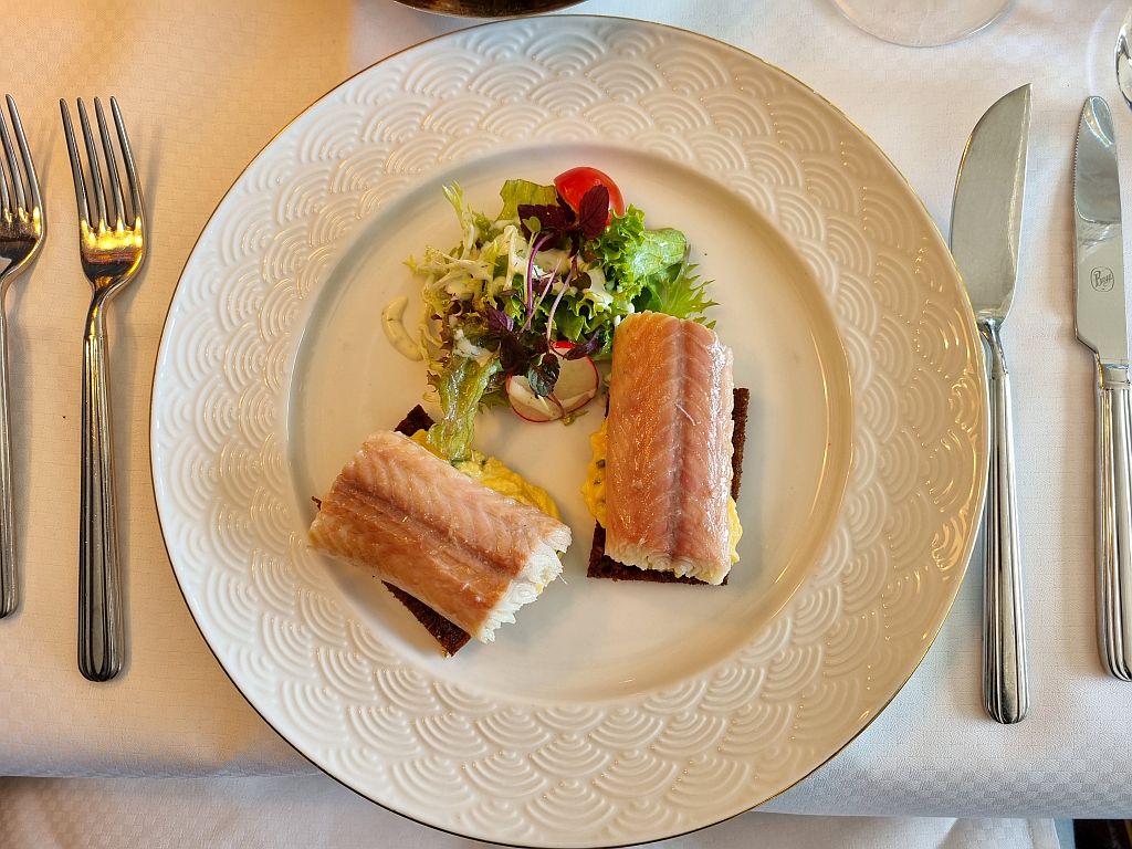Bei Jens war die Wahl der Vorspeise übrigens überhaupt nicht schwer: Aal auf Rührei und leicht angeröstetem Schwarzbrot. Vorzüglich!