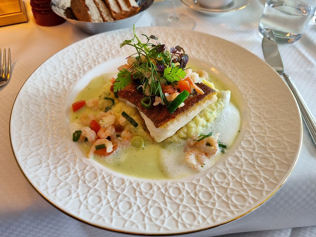 Da aber die Zeit etwas drängte, kam auch recht schnell der Hauptgang. Was bei Jens der Lengfisch (ein großer Dorsch aus der Nordsee) auf Kartoffel-Rosenkohlpüree mit Schnittlauchsauce und Tomaten-Schrimpragout war. Eine schöne Mischung aus Tradition und angedeuteter Moderne.
