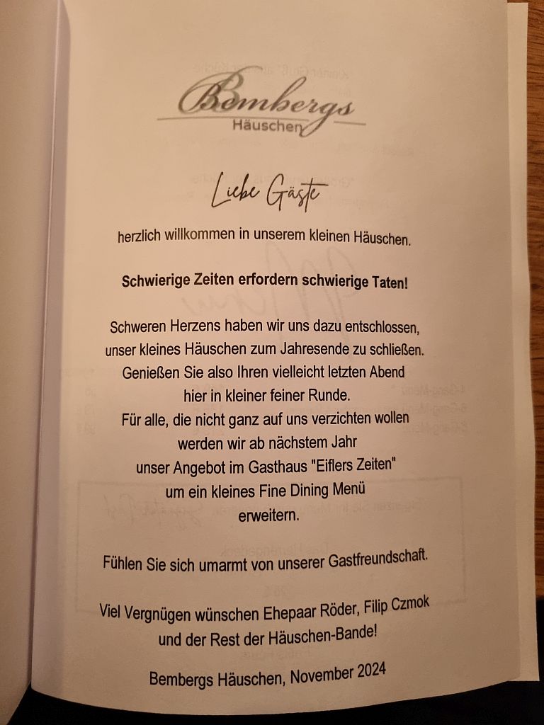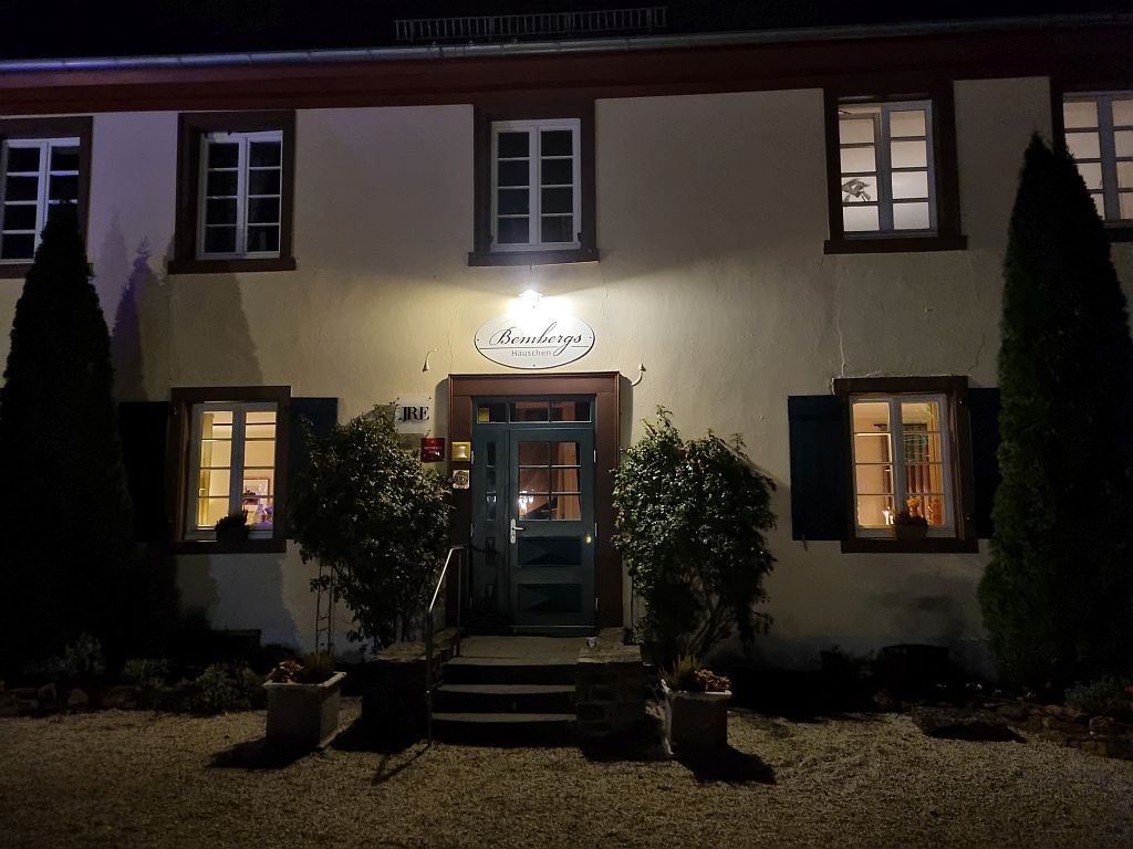 Weil es sich auf nüchternen beziehungsweise nur mit mittelmäßigen Speisen gefüllten Magen so schlecht saunieren lässt, wurde am Anreisetag noch ein entsprechender Restaurantbesuch organisiert. Passenderweise im gleich neben Euskirchen liegenden Flamersheim, im Restaurant „Bembergs Häuschen“